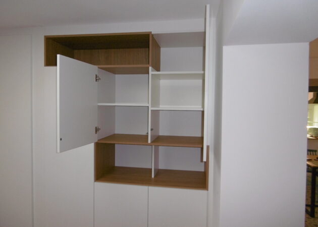Fabrication et installation d’un meuble sur mesure dans une pièce de vie. Ce projet consiste à concevoir un meuble de rangement et un cache compteur.