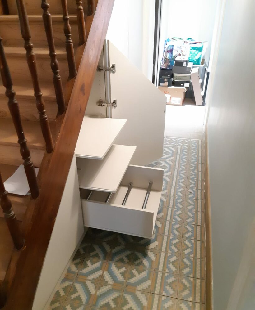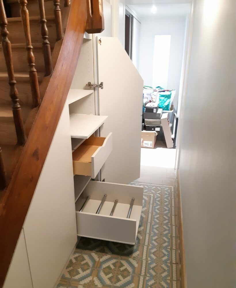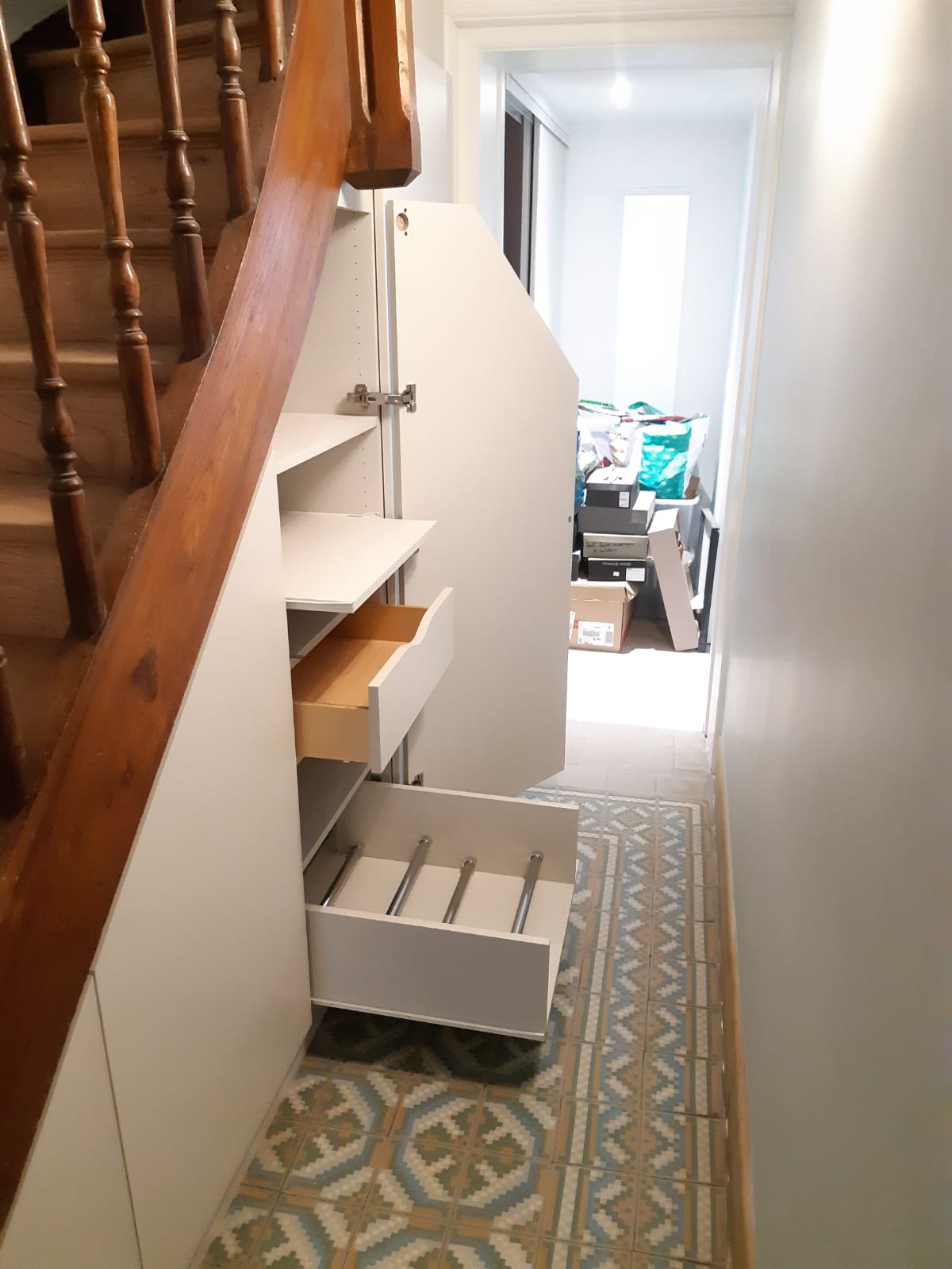 Nous avons réalisé l’aménagement sous escalier astucieux à Lambersart. La solution la plus évidente et la plus pratique pour optimiser la surface sous l’escalier ?