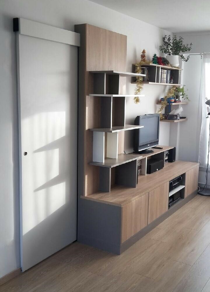 Enfin, la réalisation de ce meuble TV asymétrique répond à l’ensemble des critères fixés par nos clients. Le résultat s’intègre parfaitement dans la pièce.
