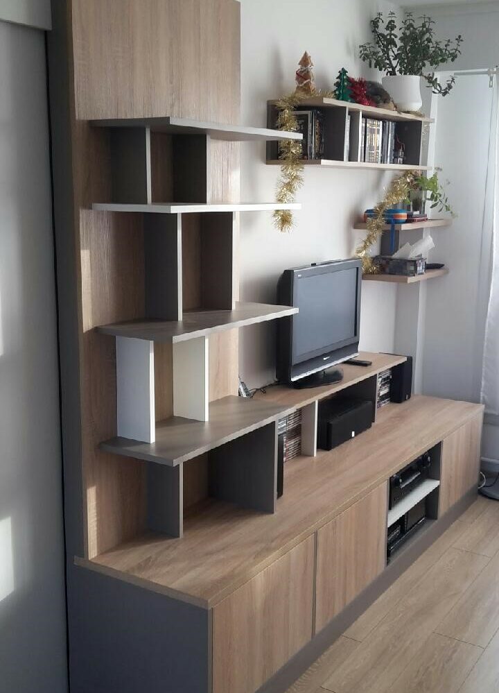 Conception sur mesure d’un meuble de télévision . Ce dernier est composé en partie basse d’un espace de rangement plus profond et fermé , ainsi qu’une partie haute et plus verticale qui permet de créer un rangement ouvert style ‘ bibliothèque ‘ … En effet , ce Meuble TV asymétrique permet de jouer avec les différentes hauteurs de livres , de BD que possède le client.