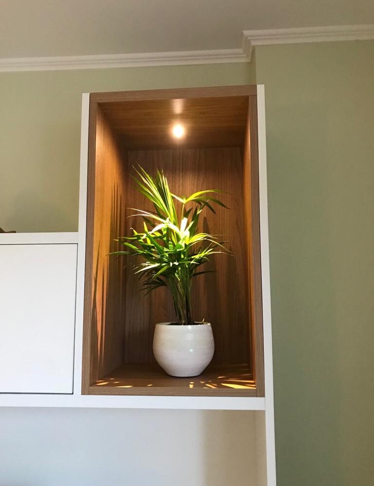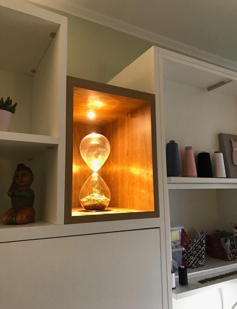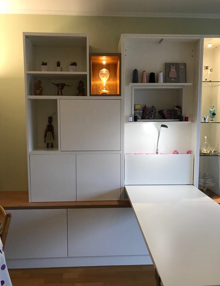 Dans un premier temps, le côté pratique a été développé. On peut remarquer que nous avons intégré des zones de stockages conséquentes afin que nos clients puissent y ranger leurs CD ou DVD par exemple. De plus, nous avons installé une table escamotable pour développer la surface plan de travail ou table à manger. Elle est complètement dissimulée dans l’agencement. Enfin, pour mettre en valeur certain objet de décoration : nous avons installé des spots.