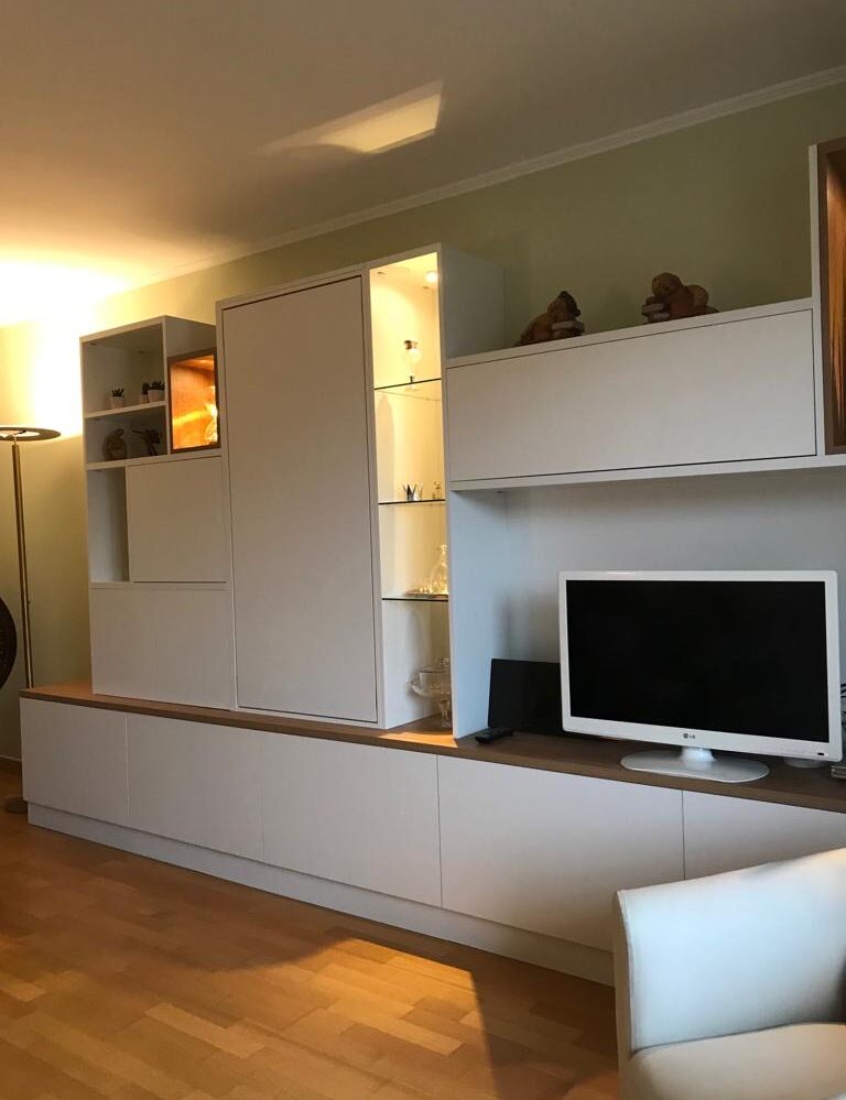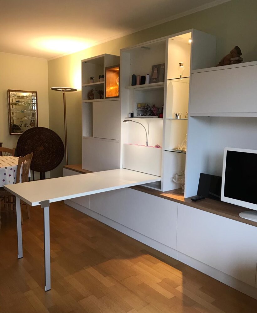 Nous avons réalisé un Meuble tv avec une table escamotable. Nous avons réalisé cet agencement sur mesure. Le but étant de satisfaire pleinement nos clients, nous avons utilisé ce procédé car il permet d’optimiser au mieux l’espace disponible dans la pièce. On obtient ainsi un résultat des plus précis. Nous avons choisi de travailler sur deux objectifs différents.