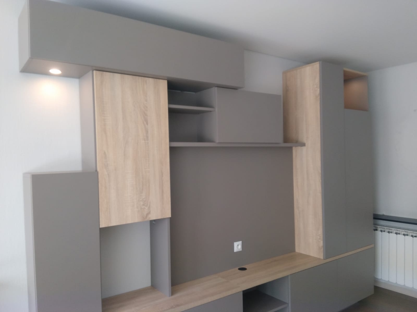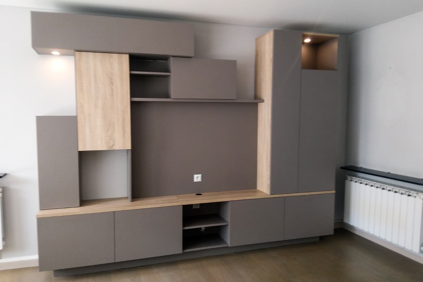 Nous avons conçu un meuble tv déstructuré. Effectivement, nous avons réalisé ce meuble pour accueillir la télévision avec des rangements partiellement ouverts et fermés. Cependant , ces rangements ont aussi des profondeurs différentes pour répondre aux mieux aux besoins des clients.