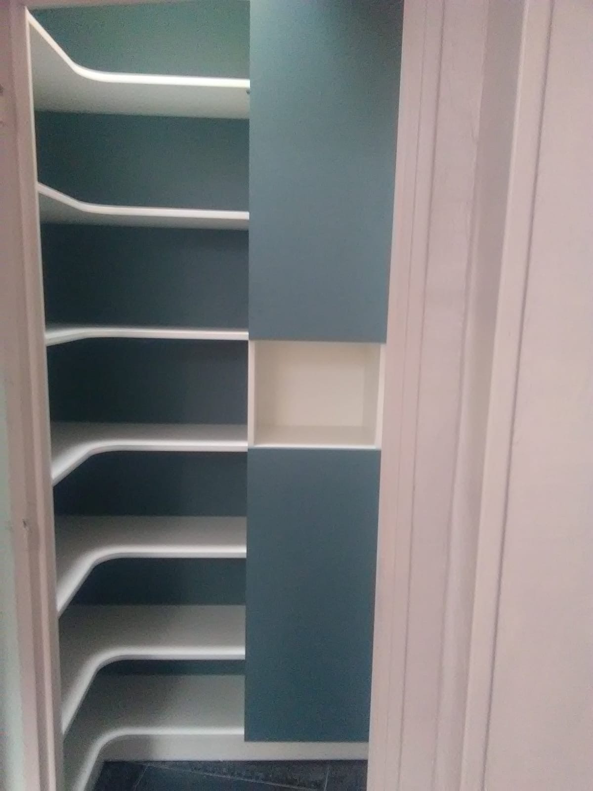 Nous avons utilisé l’espace disponible aussi petit soit il pour optimiser le rangement . Nous avons opté pour des étagères d’angles et un espace tout de même fermé qui se trouve devant la porte.