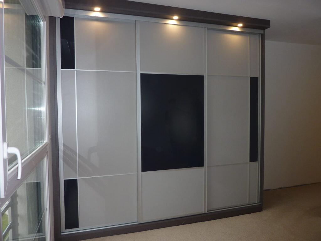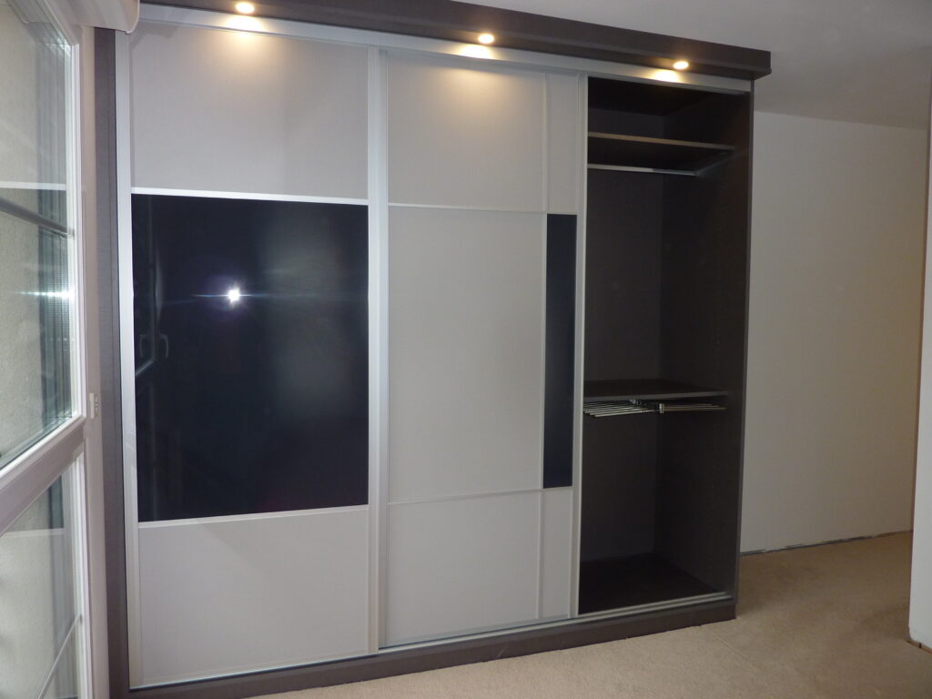 Encore une réalisation de placard sur mesure avec des portes coulissantes. Nos clients de Comines ont finalement choisi exactement les mêmes façades que celles de notre show room de Wambrechies. Une différence, cependant: celles de notre show room sont motorisées…Conception asymétrique, avec un mélange de panneaux décor et de verre laqué. Quant au mécanisme, roulements à bille et système anti-déraillement.