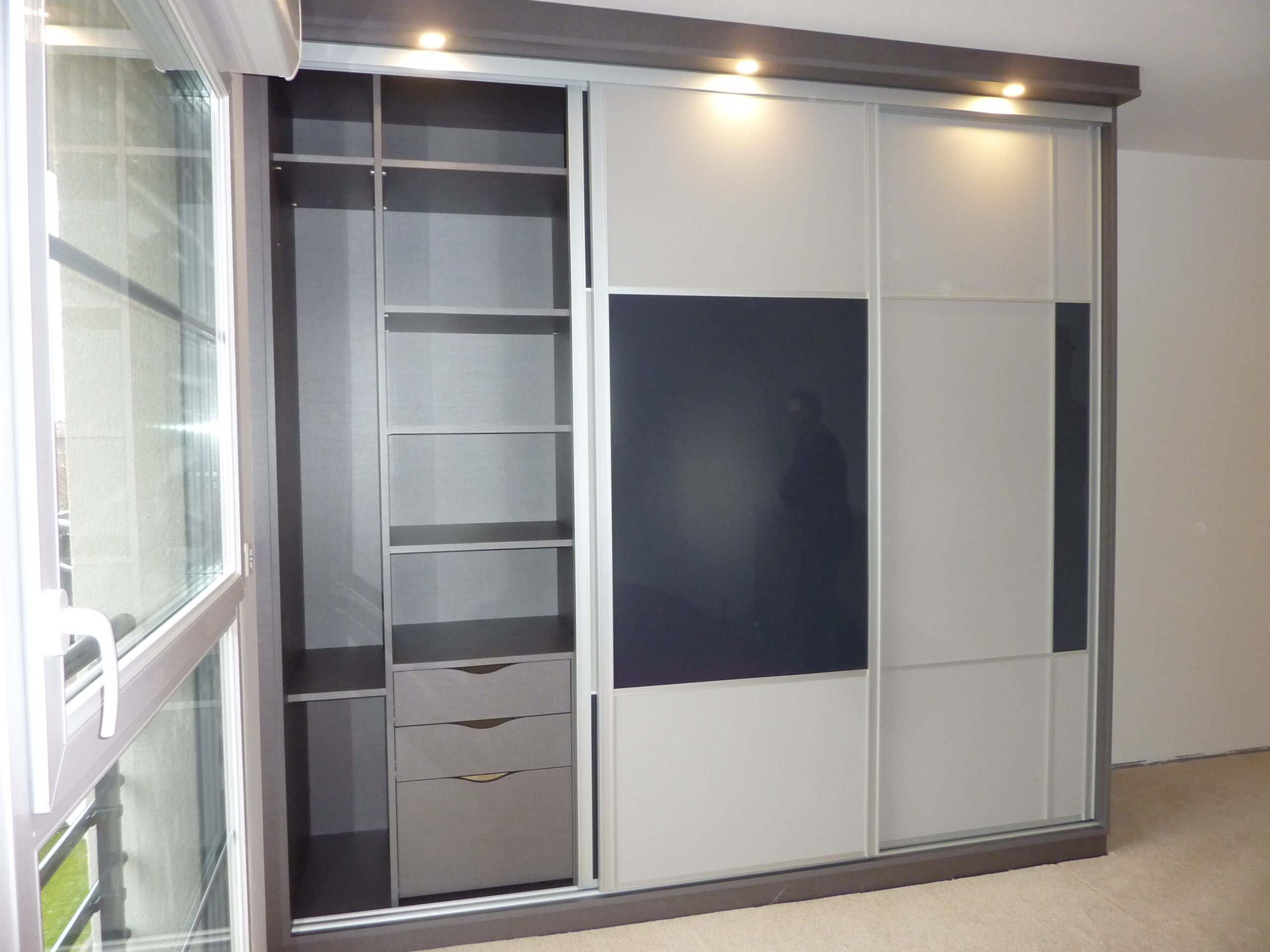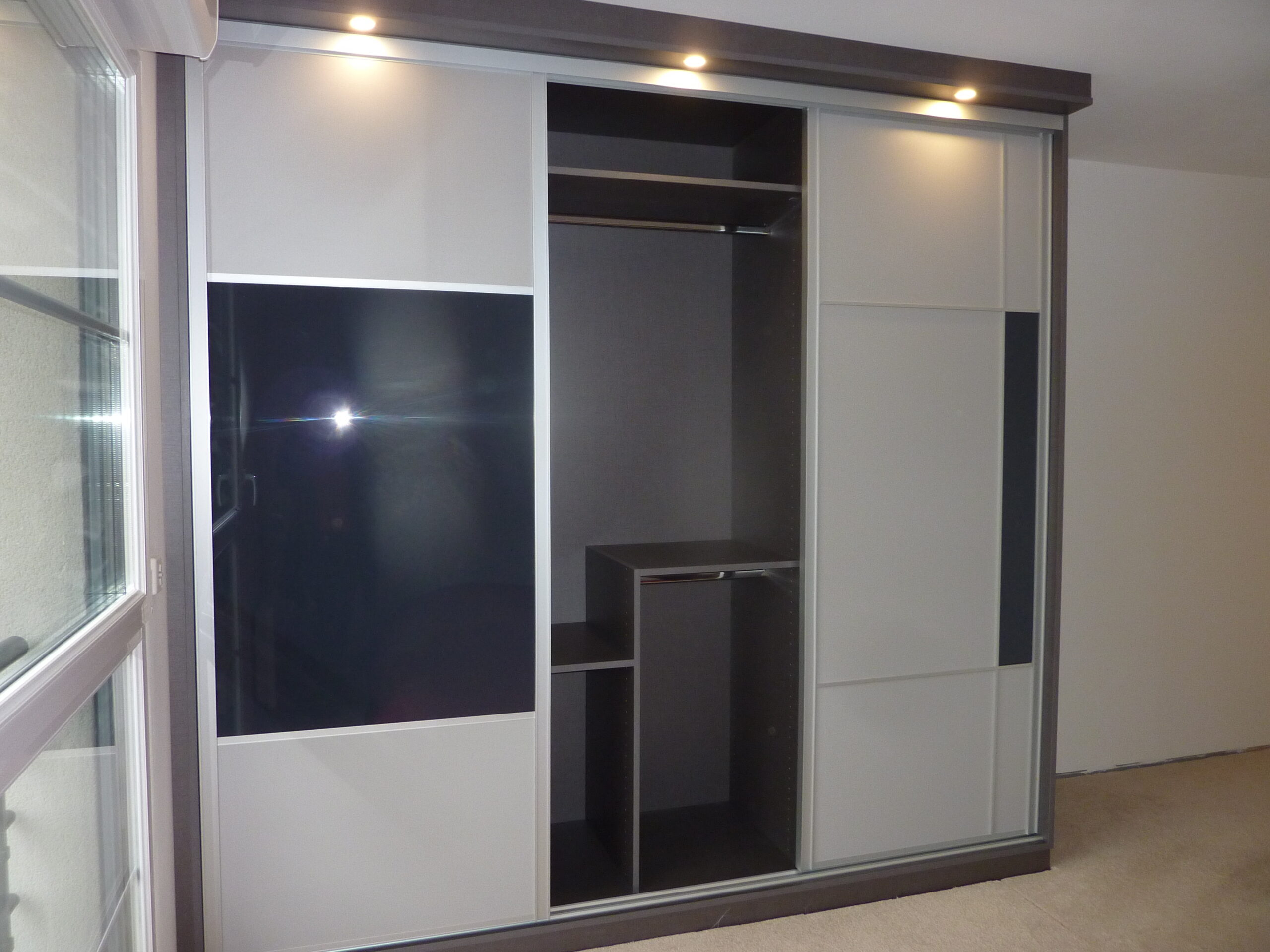 Encore une réalisation de placard sur mesure avec des portes coulissantes. Nos clients de Comines ont finalement choisi exactement les mêmes façades que celles de notre show room de Wambrechies. Une différence, cependant: celles de notre show room sont motorisées…Conception asymétrique, avec un mélange de panneaux décor et de verre laqué. Quant au mécanisme, roulements à bille et système anti-déraillement.