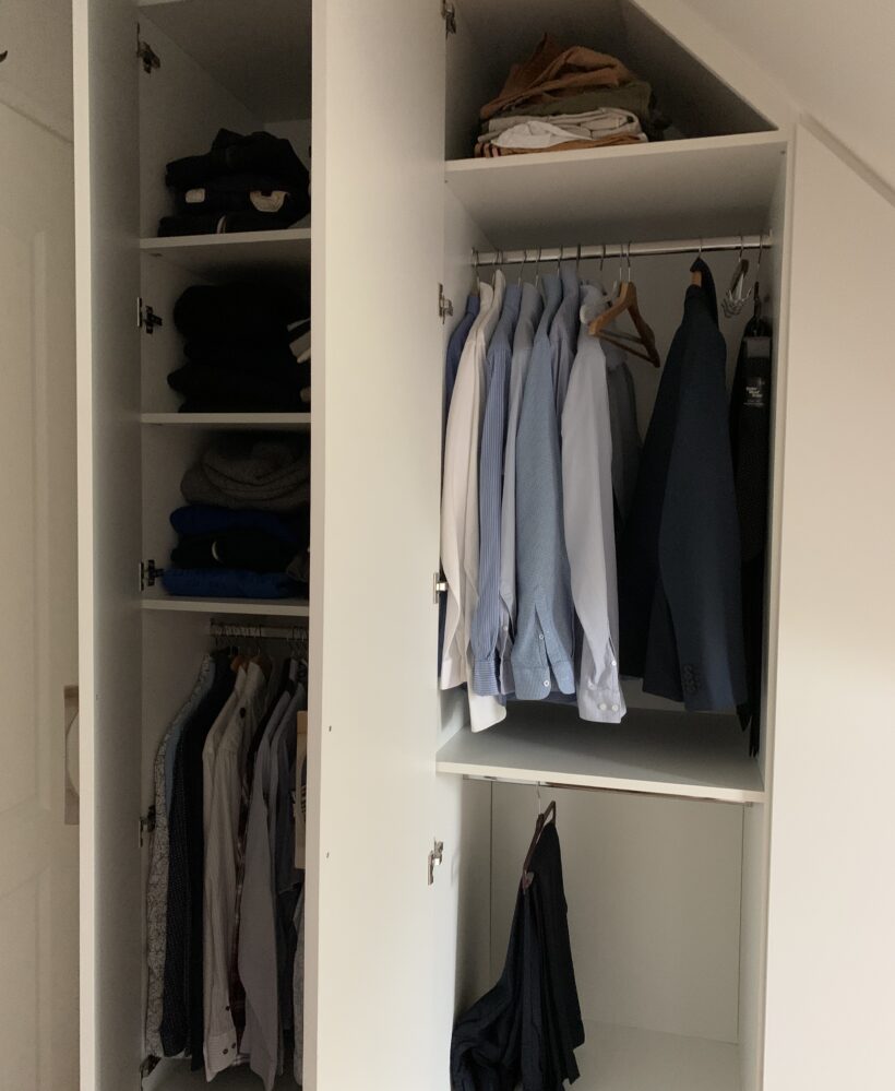 Aménagement d’un placard sous mansarde avec niche décorative. Afin de mener à bien ce projet, nous avons écouté attentivement les attentes de nos clients dans le but de pouvoir leur proposer un résultat à la hauteur de leurs attentes. À noter que ce placard a été réalisé sur mesure afin d’optimiser au mieux l’espace disponible dans la pièce. Nous avons donc choisi de travailler sur deux objectifs principaux.