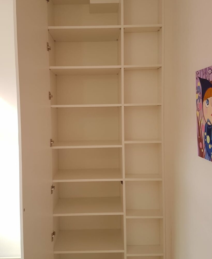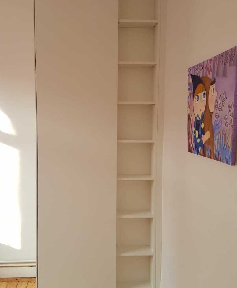 Nous vous trouvons une solution en concevant un placard sur mesure. Entièrement réalisé pour répondre aux besoins : Vous pouvez ranger des vêtements, des jouets, des livres… Tout est possible.