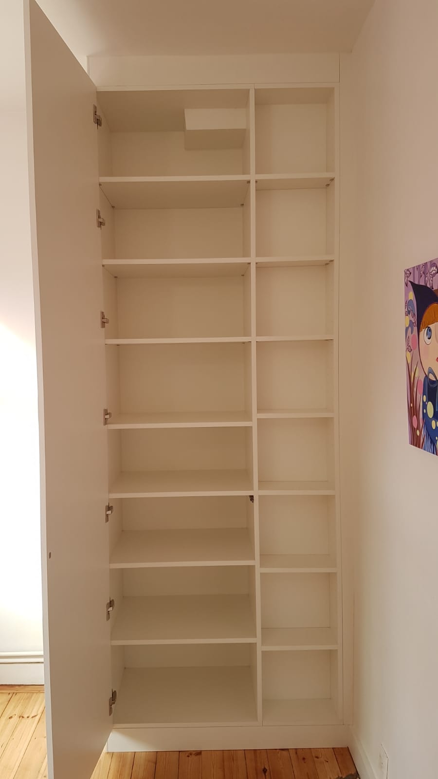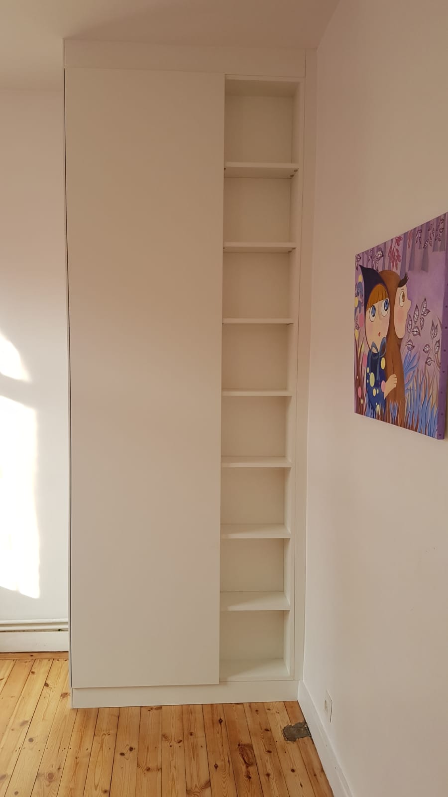 Nous vous trouvons une solution en concevant un placard sur mesure. Entièrement réalisé pour répondre aux besoins : Vous pouvez ranger des vêtements, des jouets, des livres… Tout est possible.