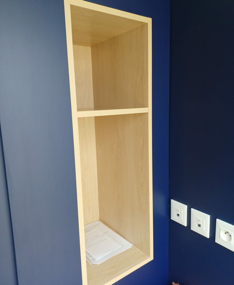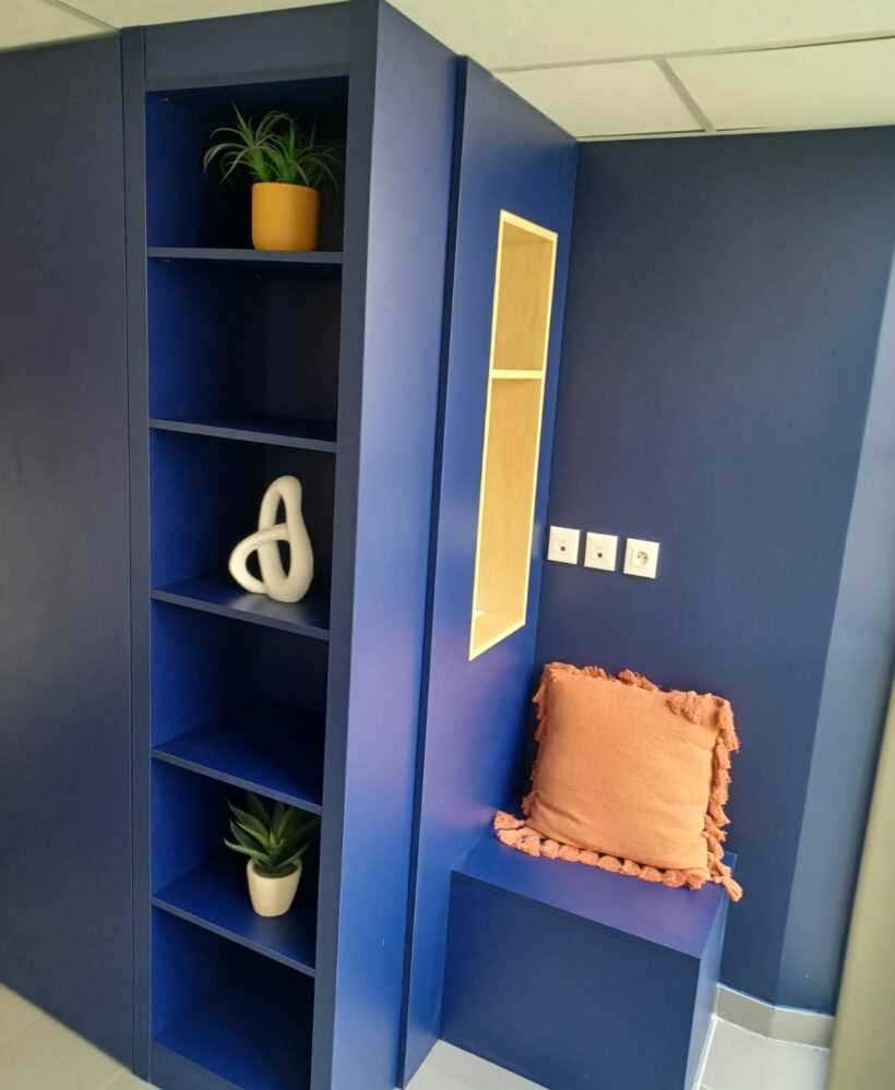 Espace pour s’asseoir, niche déco encastrée, et étagère déco personnalisée