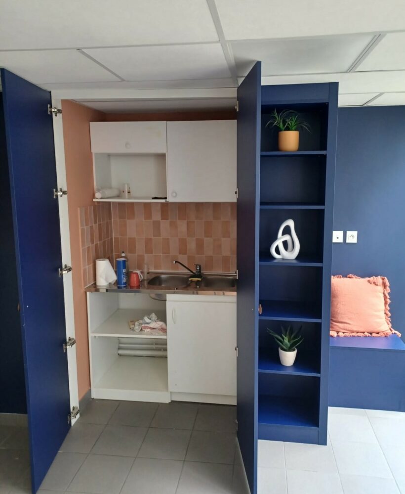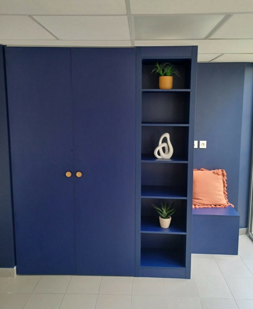 Rangements et kitchenette dissimulée pour un local professionnel dans le Nord.