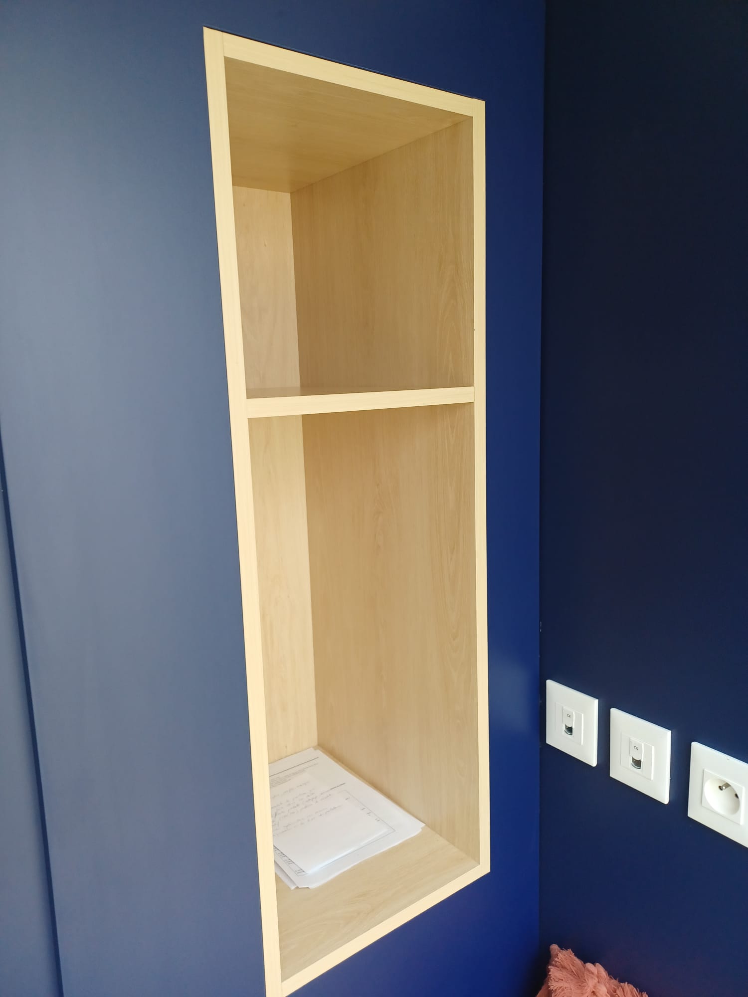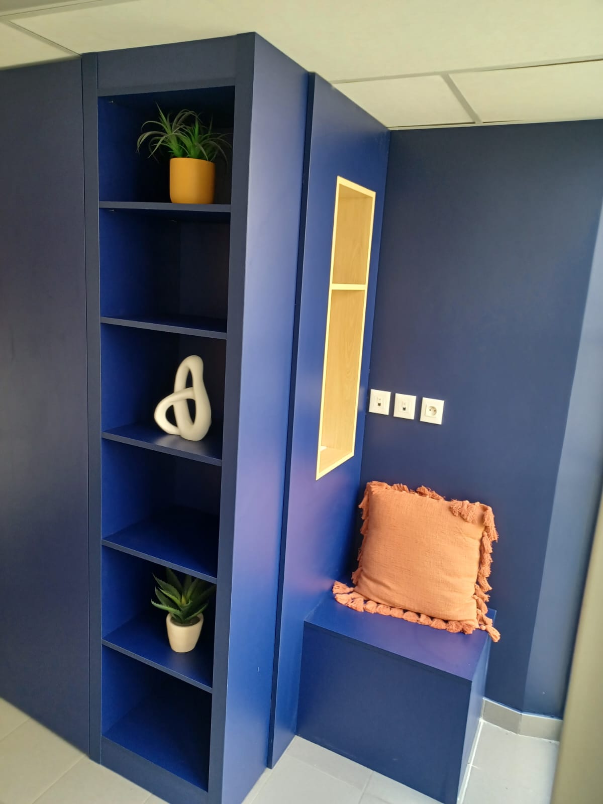 Espace pour s’asseoir, niche déco encastrée, et étagère déco personnalisée