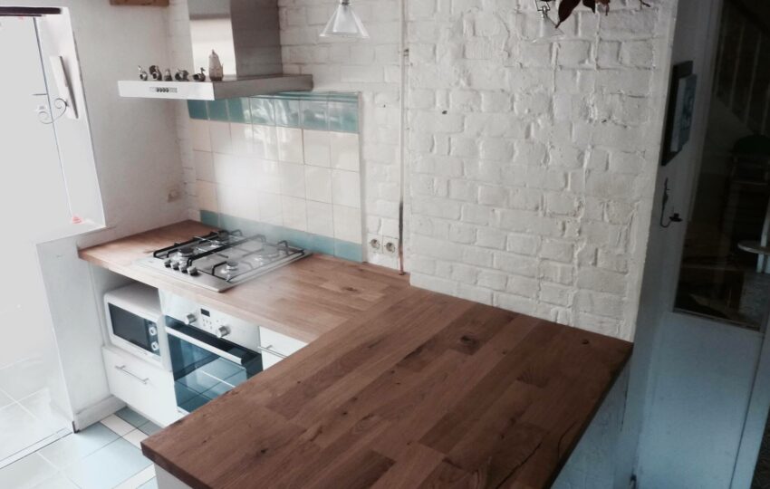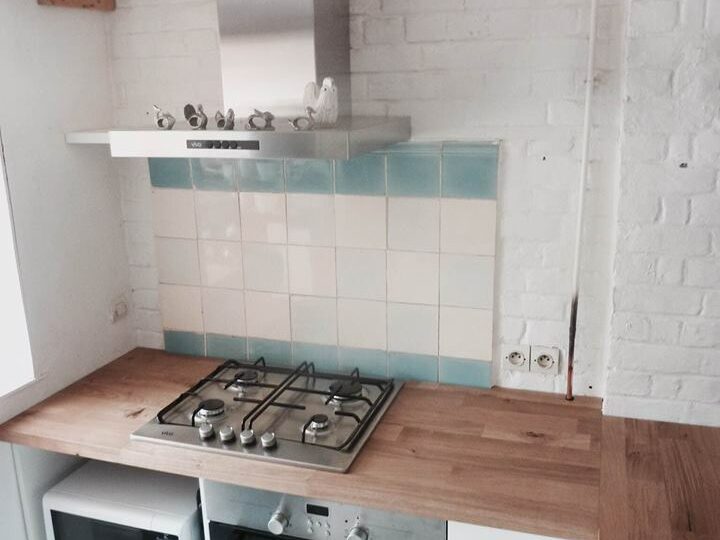 Pour se faire , nous avons opté pour un plan de travail en bois massif , aspect rustique . Les meubles caissons sont donc restés blanc et nous avons choisi des poignées identiques à l’existant . Ensuite nous avons décidé de garder la crédence carrelage d’origine , qui permettait également d’ajouter un peu de couleur à la pièce très neutre . De plus , cela permettait de faire un rappel avec le carrelage existant.