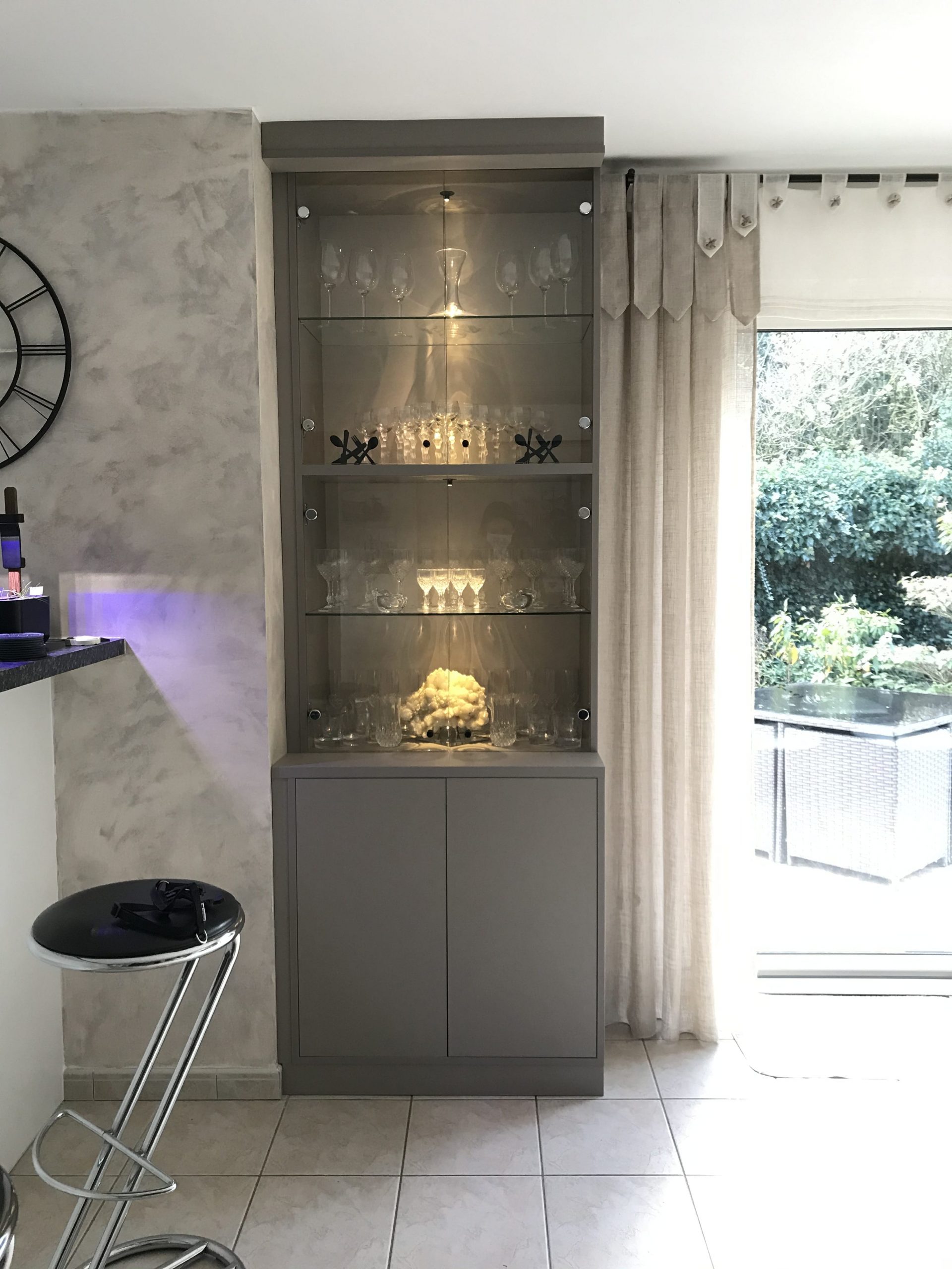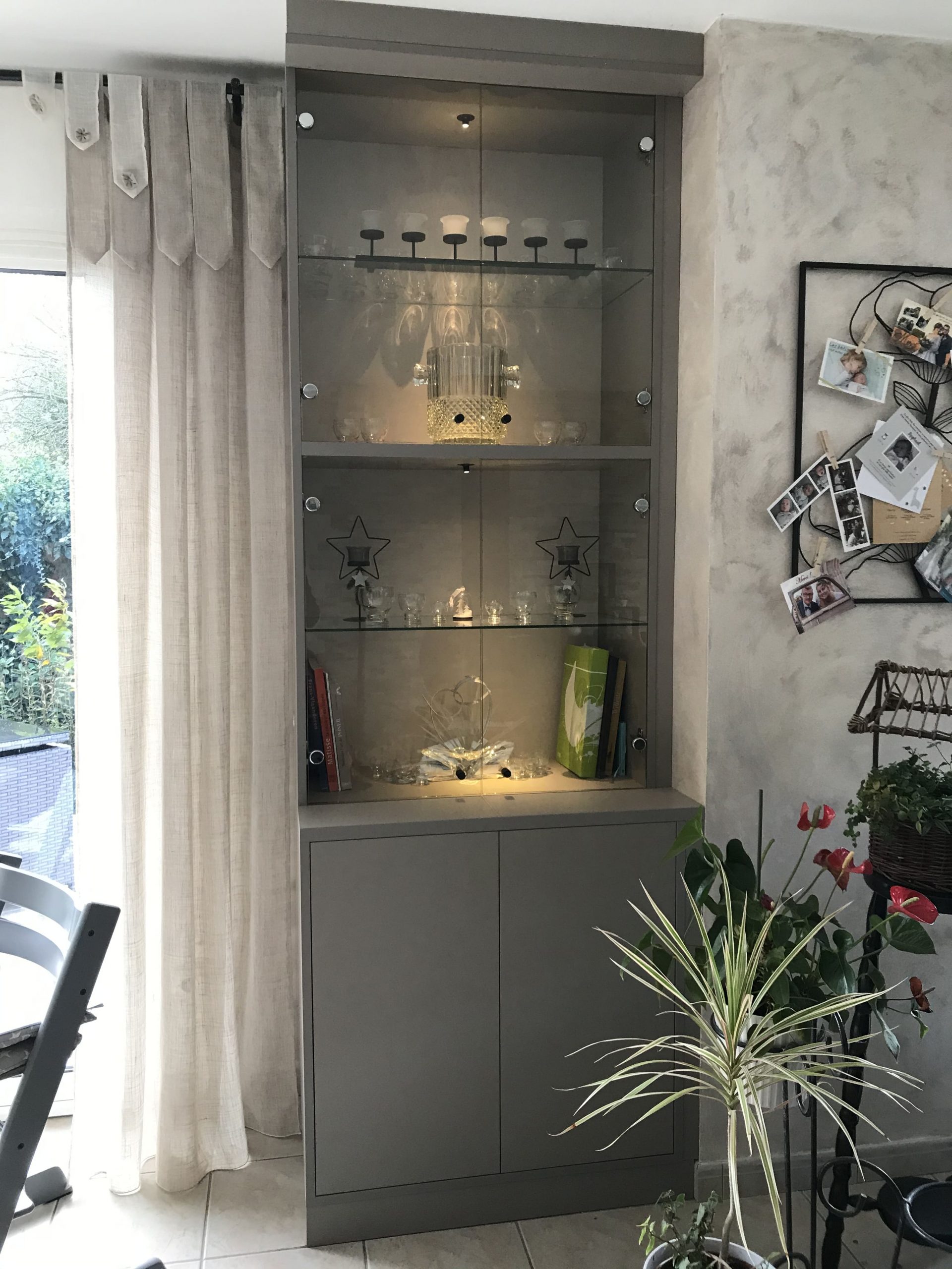 Ces vitrines sur mesure sont donc le résultat qui s’adapte parfaitement aux attentes. Elles contiennent des solutions de rangements ainsi qu’une large surface à décorer. Les couleurs choisies s’adaptent parfaitement à la pièce. Ces deux meubles s’intègrent parfaitement à la pièce. C’est avec plaisir que nous avons réalisé ce projet.