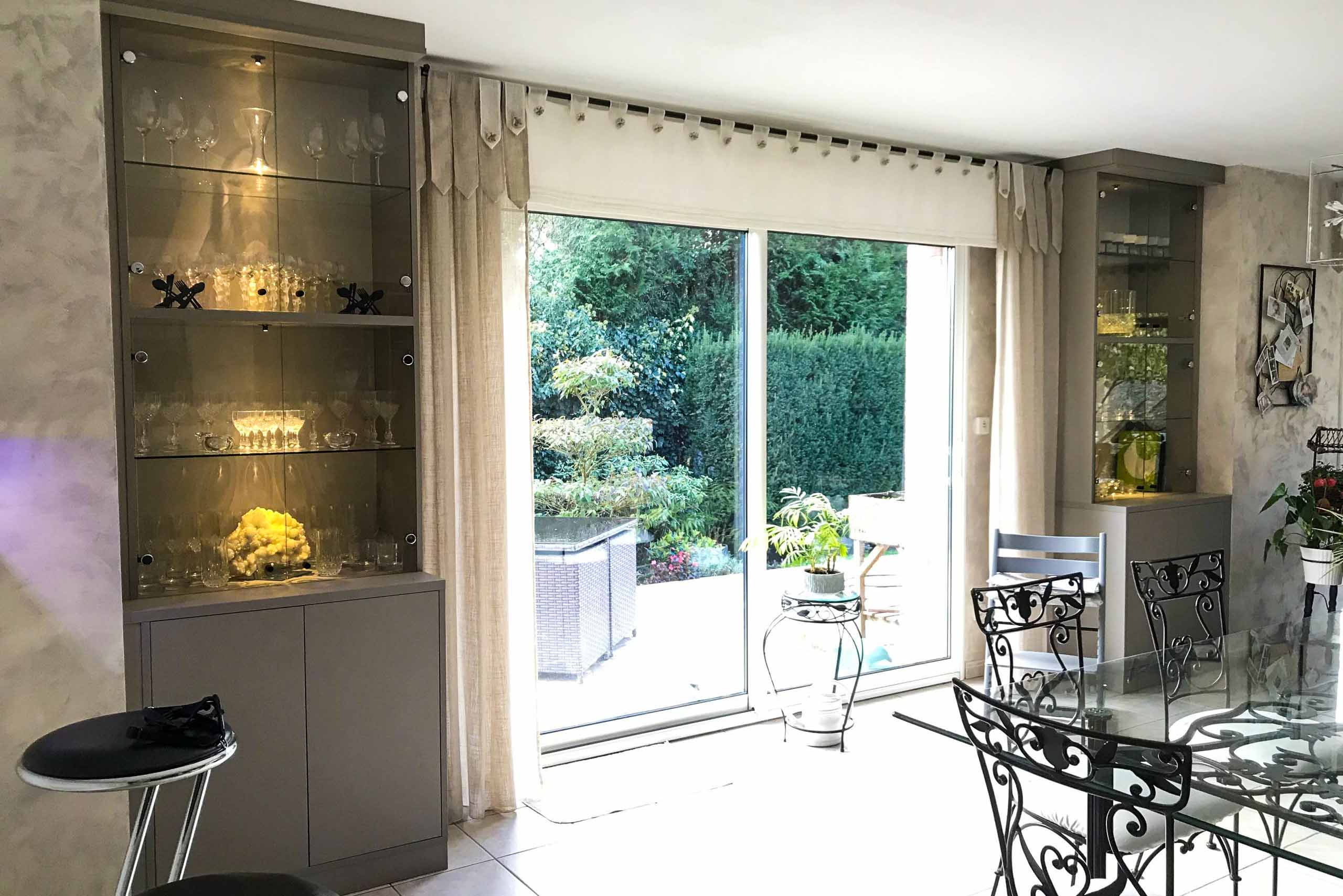 Nous avons conçu des vitrines sur mesure. En effet, de chaque côté de la baie coulissante nous avons installé une vitrine avec des portes vitrées en partie haute. Elles permettent d’exposer de la décoration ou de la vaisselle sans avoir à dépoussiérer tous les jours !